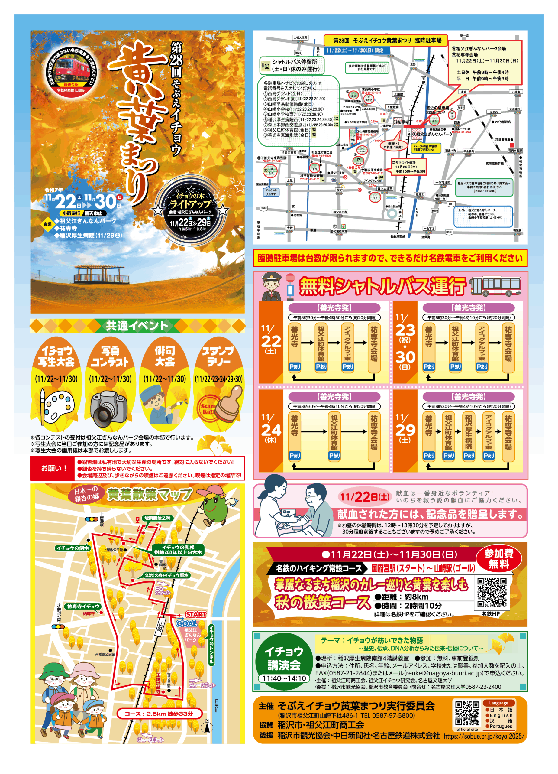 令和7年のそぶえイチョウ黄葉まつりは、11/22(土)~11/30(日)の開催となります。